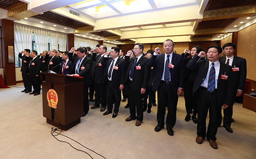大会选举产生的其他国家工作人员在绍兴饭店鲁园2号夏厅进行宪法宣誓仪式。(夏斌 谭尧杰/文 鲁慧川/摄)